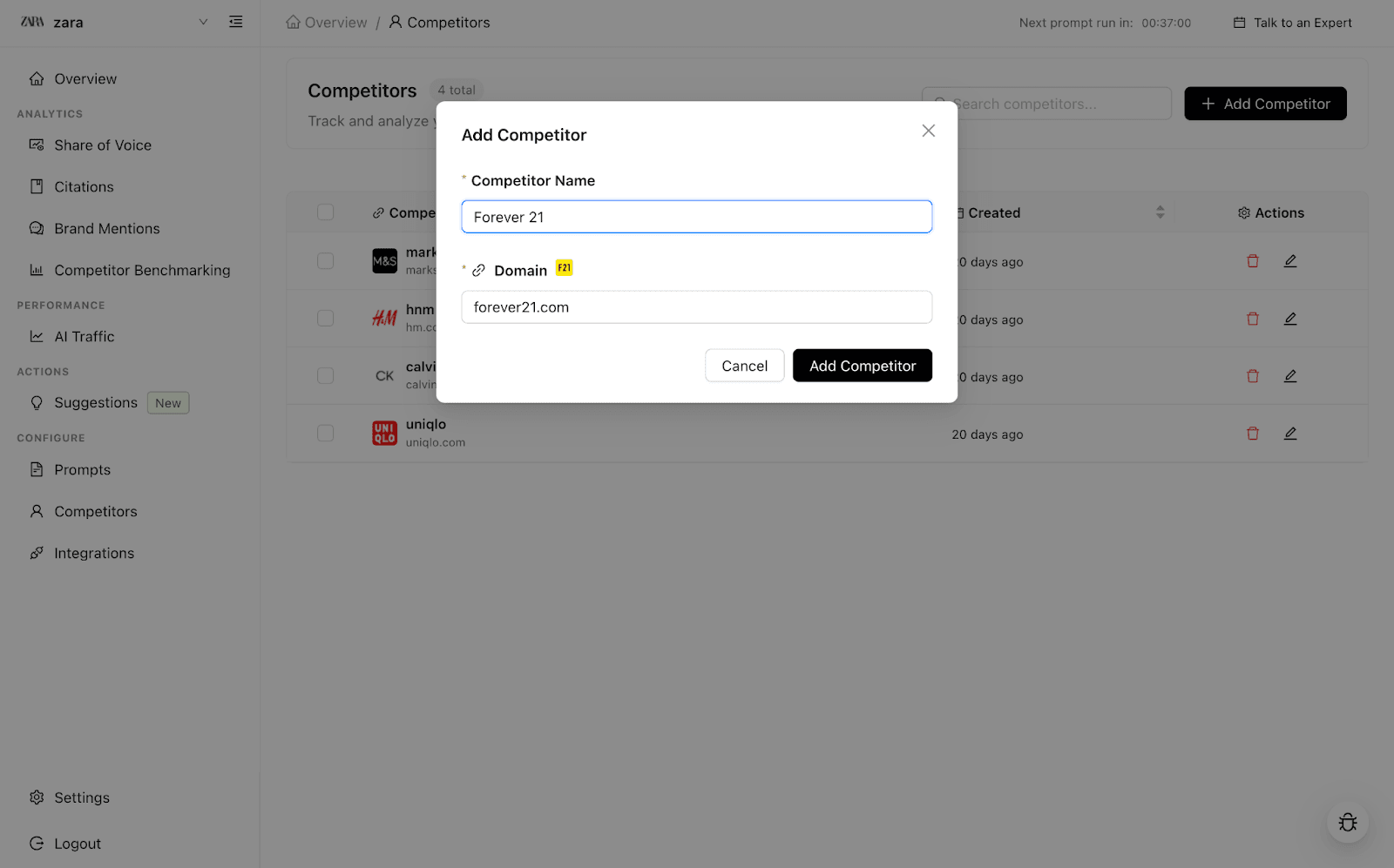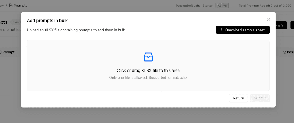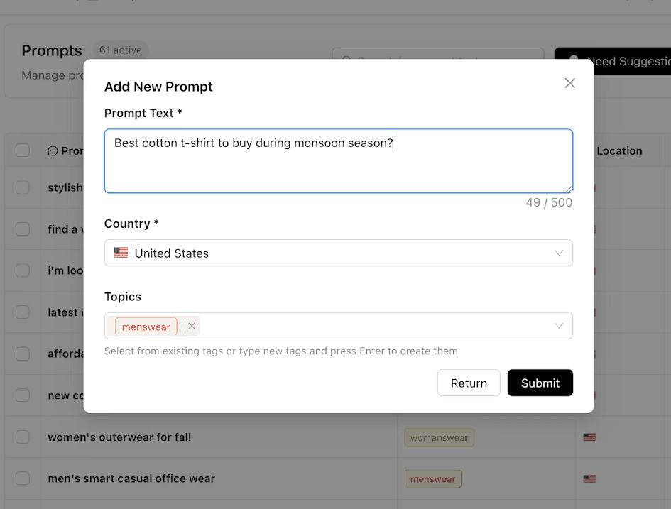 Hit “Add Prompt” and enter real buyer or industry questions (Eg: “Who is the best SaaS provider for startups?”/ “Where to purchase the best cotton shirt for fast delivery?” ).