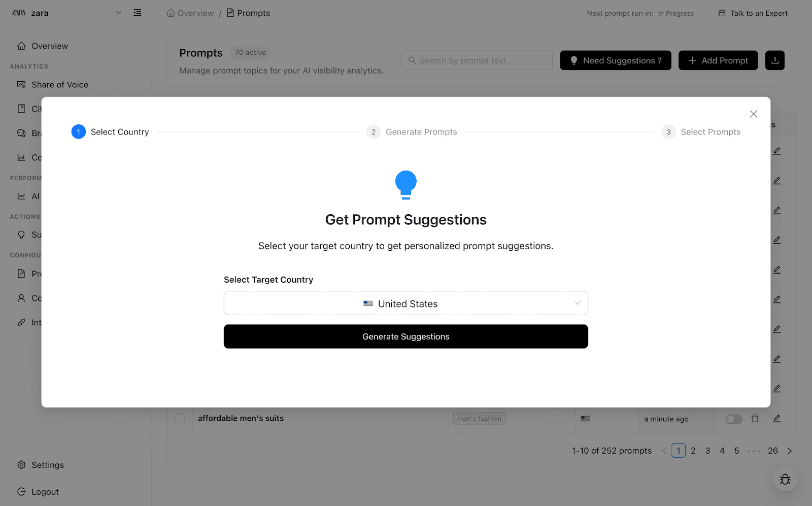 Still Unsure or feeling lazy? Let us suggest which prompts to track and optimize. In Prompts section,